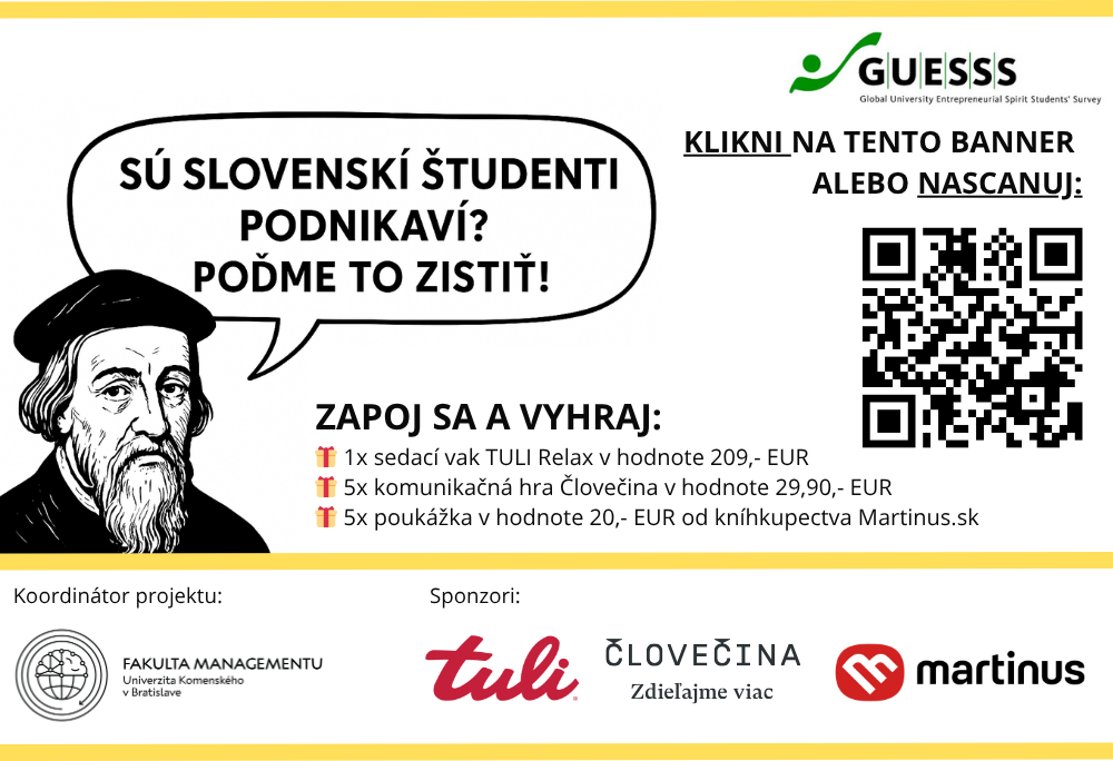 The GUESSS project is brought to Slovakia by Comenius University Bratislava, Faculty of Management. Sponsors of prizes: TULI, Človečina, and Martinus.sk.