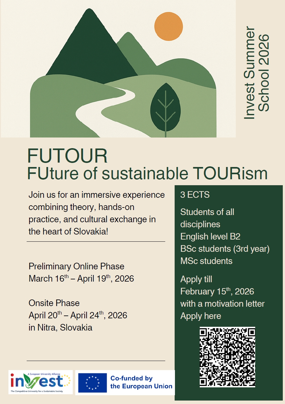 Invitation to the Summer School: INVEST Future of Sustainable Tourism. The event will take place in a hybrid format (online) and in-person from April 20 to 24, 2026, at the Slovak University of Agriculture in Nitra. For more information, please see the attached flyer: https://is.uniag.sk/auth/dok_server/slozka.pl?id=2892;download=73050;lang=sk