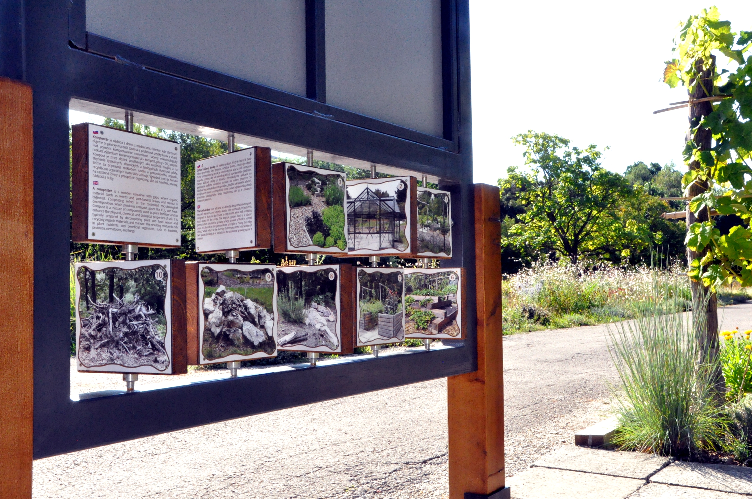 Pozostáva z viacerých zón, medzi ktorými je jedlý les, lúka, vyvýšené záhony, záhon „kľúčové dierky“ a bylinkový labyrint. Nechýba ani oddychová zóna. „Ukážkovú záhradu sme vytvorili najmä ako inšpiráciu pre ľudí. Chceli sme ukázať, že aj na malom pozemku možno vytvoriť udržateľný a bohatý ekosystém. Stále je v nej niečo zaujímavé na pozorovanie či konzumáciu, napríklad bobule, listy, stonky, korene či huby,“ hovorí odborná zamestnankyňa Botanickej záhrady SPU inžinierka Jana Šlosárová.