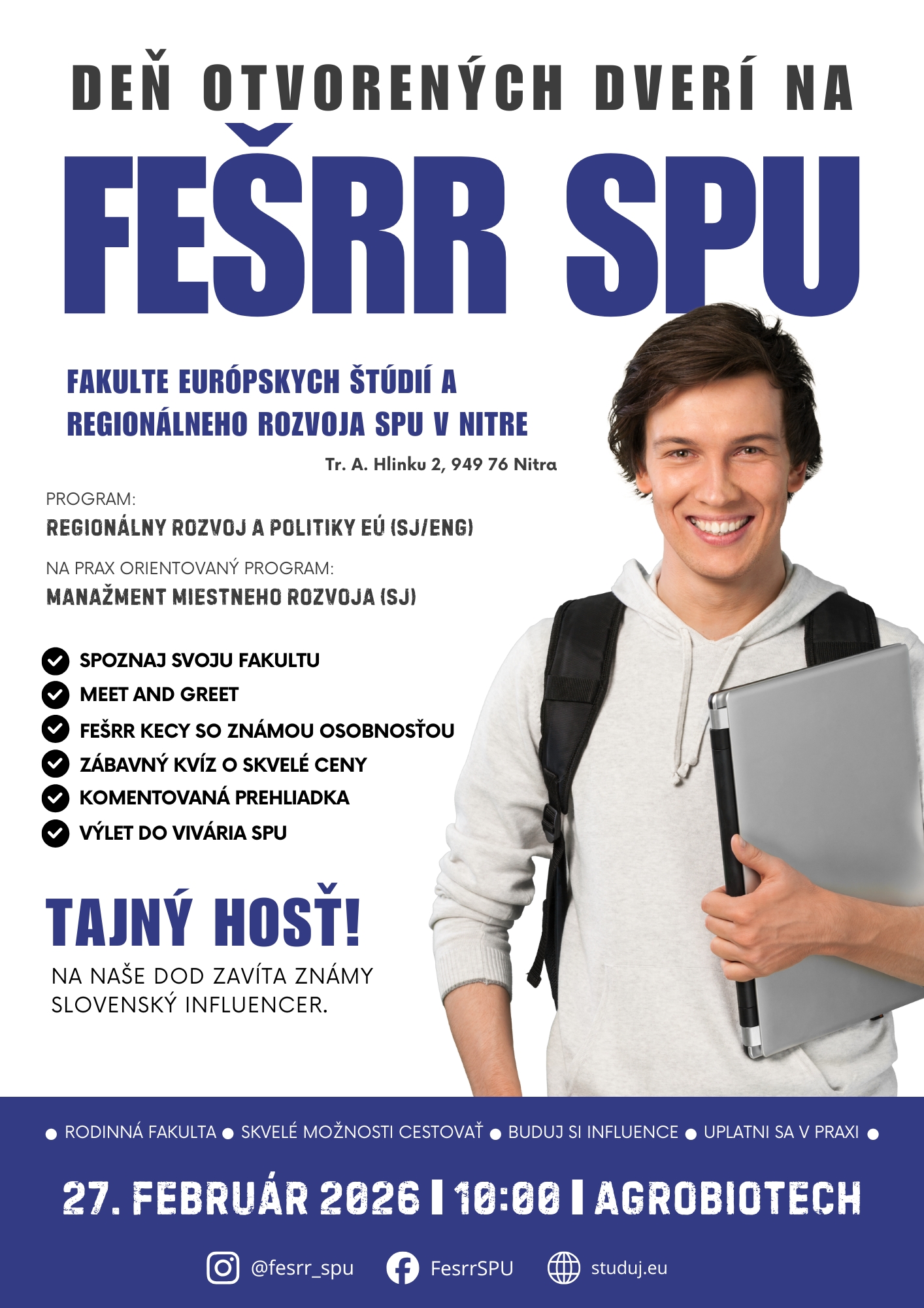 ROZHODUJEŠ SA, KAM SI PODAŤ PRIHLÁŠKU?  Zaujímaš sa o európske politiky, regionálny rozvoj, verejnú správu či manažment miestneho rozvoja? Fakulta európskych štúdií a regionálneho rozvoja ťa pozýva na Deň otvorených dverí FEŠRR