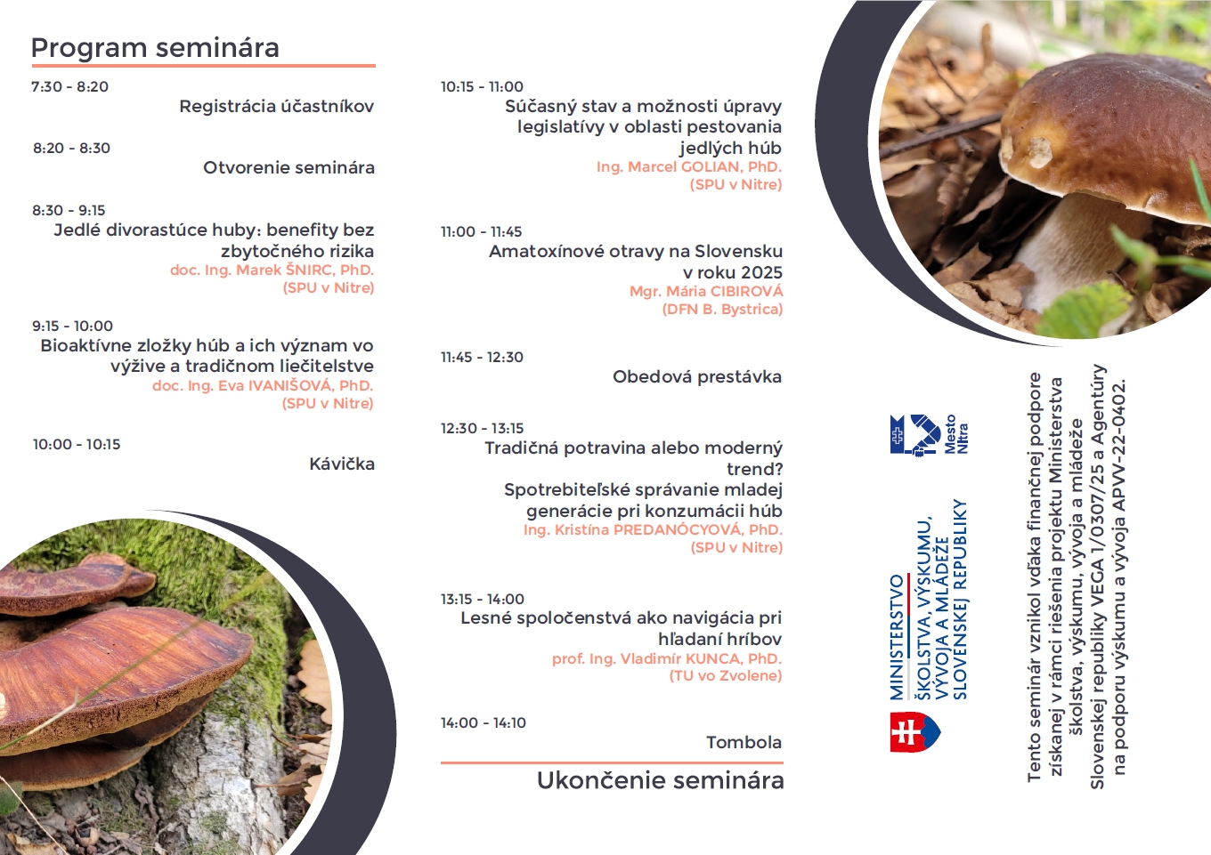 - 08:30 – 09:15 Jedlé divorastúce huby: benefity bez zbytočného rizika doc. Ing. Marek Šnirc, PhD. (SPU v Nitre)