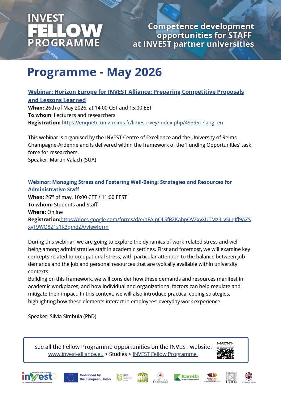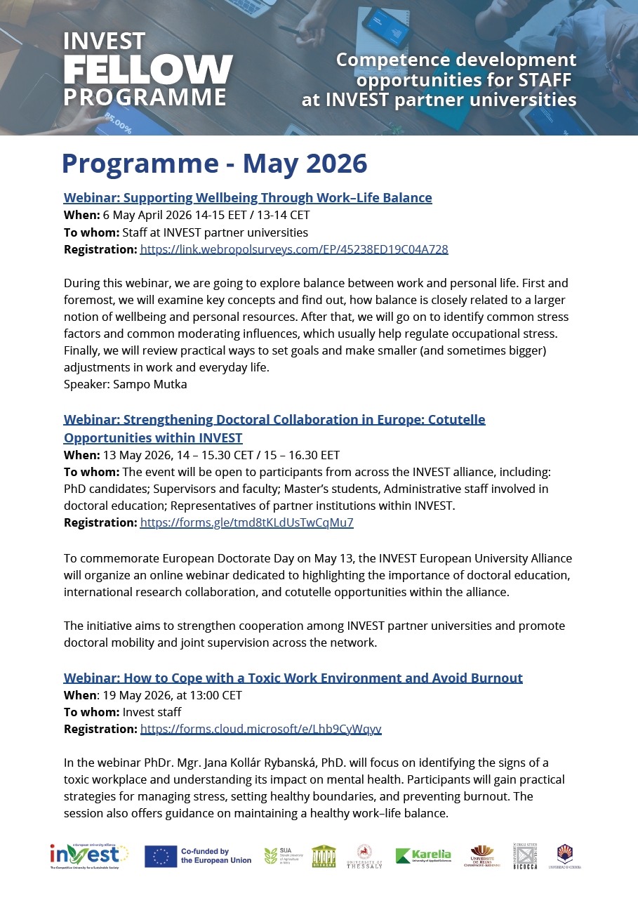 To whom: The event will be open to participants from across the INVEST alliance, including: PhD candidates; Supervisors and faculty; Master’s students, Administrative staff involved in doctoral education; Representatives of partner institutions within INVEST.