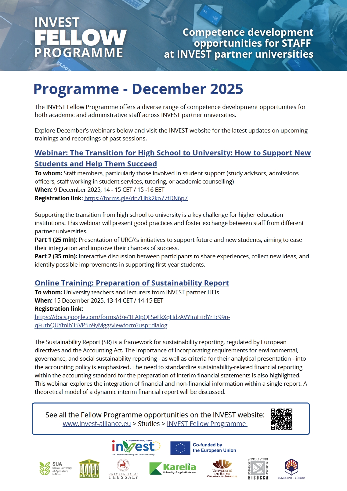 Program INVEST Fellow ponúka širokú škálu príležitostí na rozvoj kompetencií pre akademických aj administratívnych pracovníkov partnerských univerzít INVEST.