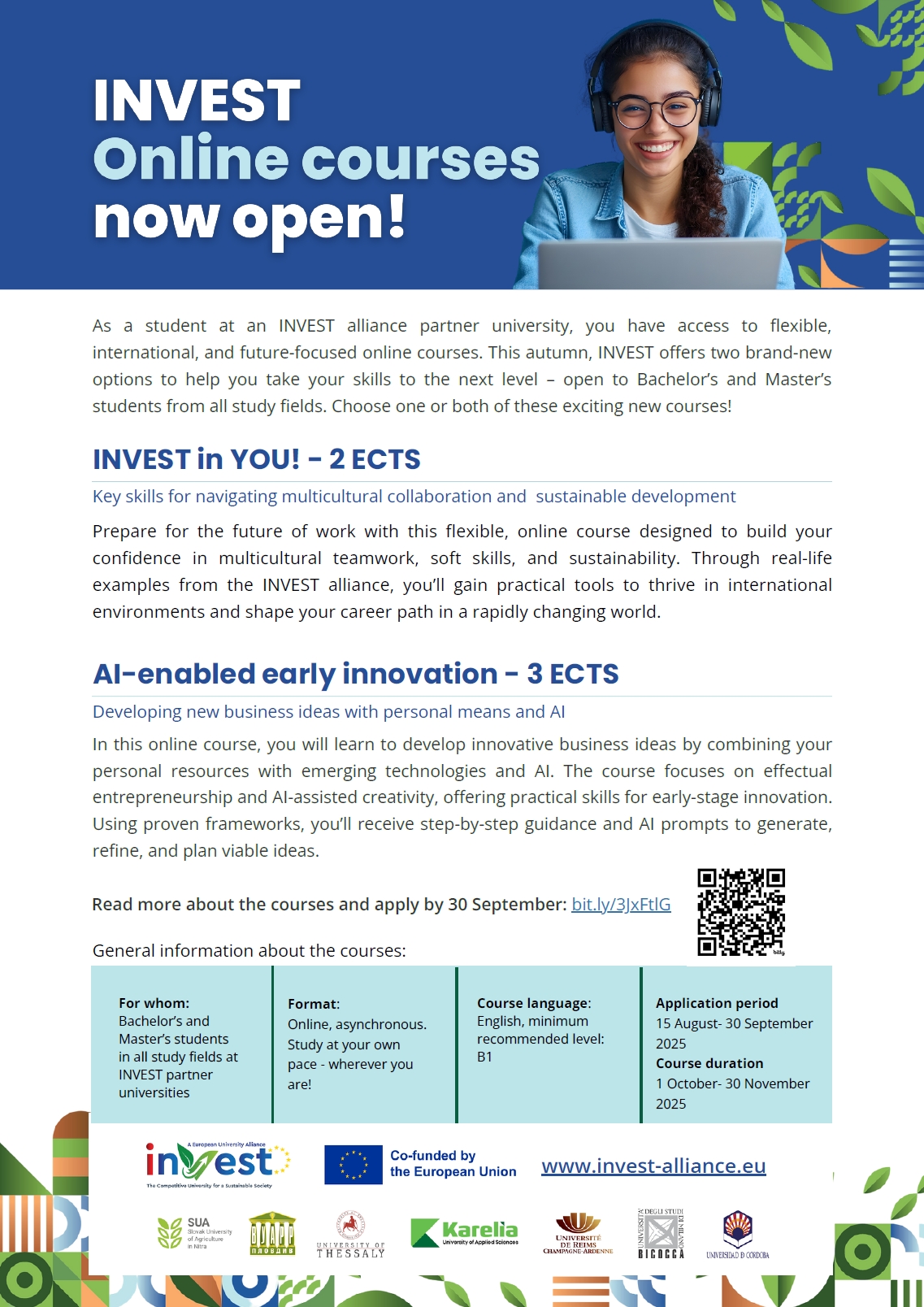 - Informácie o kurzoch a registrácii: https://www.karelia.fi/en/invest-online-courses/