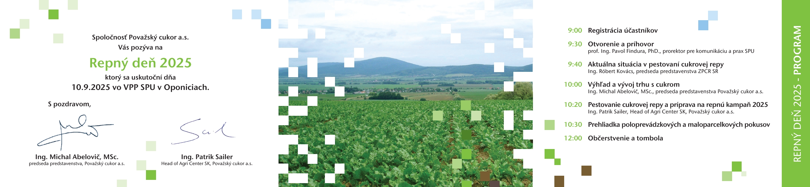 Pozývame vás na Repný deň 2025, ktorý organizuje spoločnosť Považský cukor a.s., 10. septembra 2025 od 9:00 v priestoroch Vysokoškolského poľnohospodárskeho podniku SPU v Oponiciach.